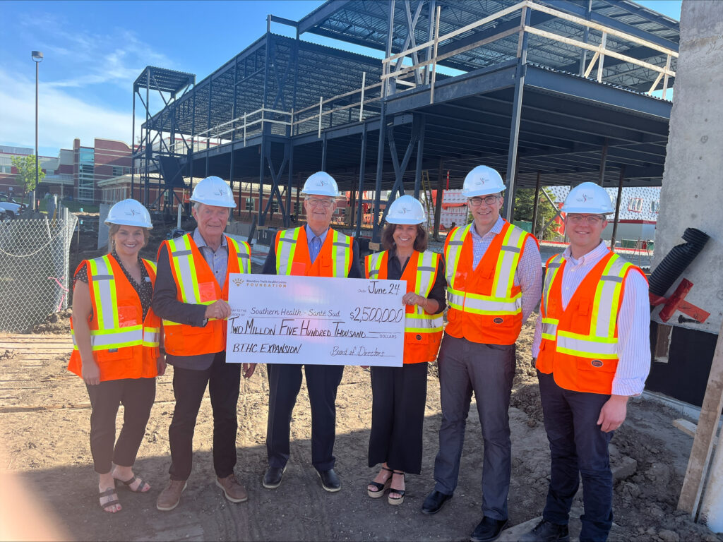 Ahead of the Boundary Trails Health Centre Foundation’s Annual General Meeting, the BTHC Foundation Board of Directors presented Southern Health-Santé Sud with its first payment towards the $10 million pledge for the expansion of BTHC. Against the backdrop of a busy construction site, BTHC Foundation Board Chair Ben Friesen, along with Vice Chair Ernie Penner and Executive Director Shannon Samatte-Folkett handed over a cheque for $2.5 million. It’s a truly remarkable achievement when one considers that just 12 short months ago, ground was broken and construction began at the expansion site.