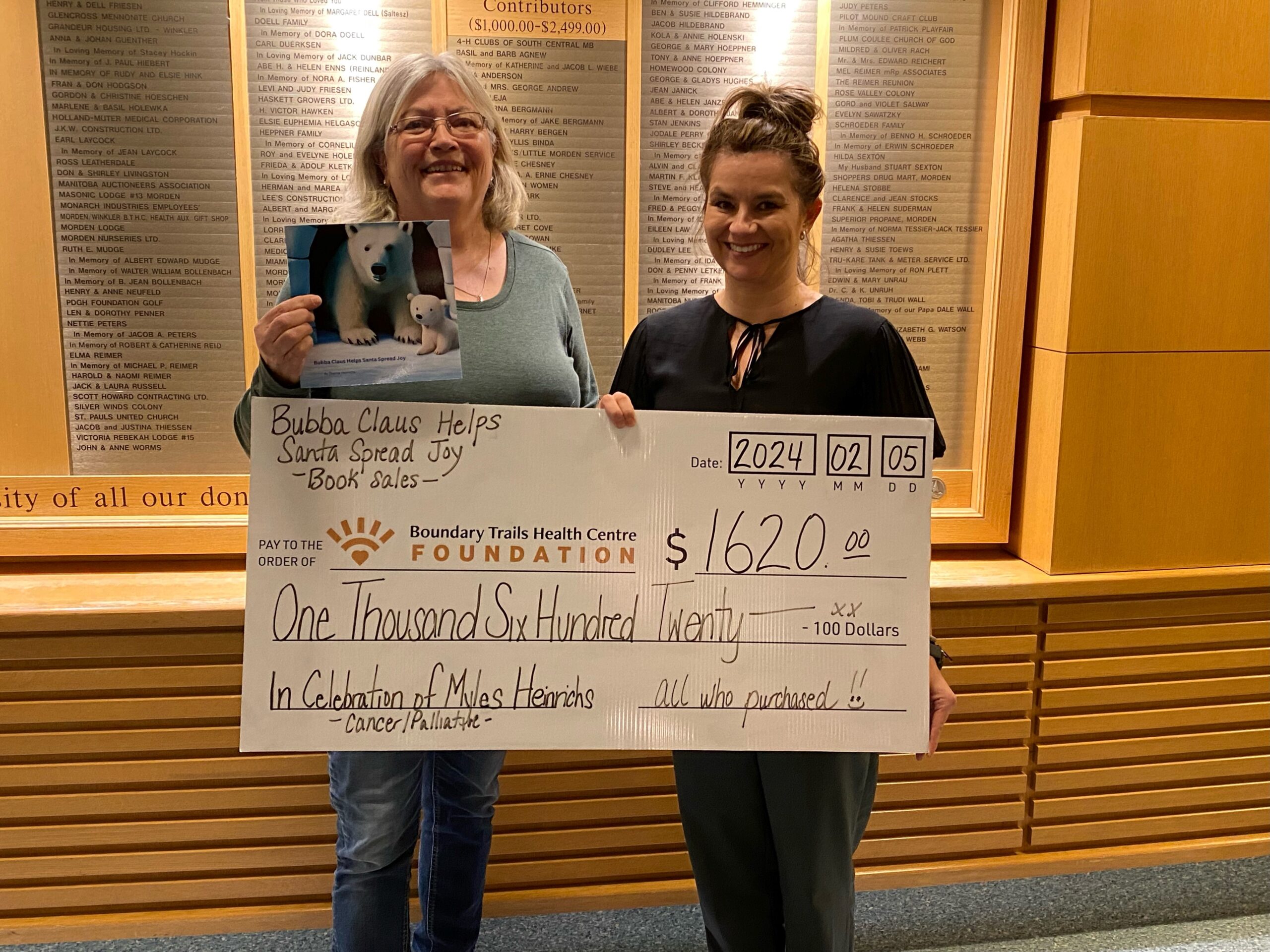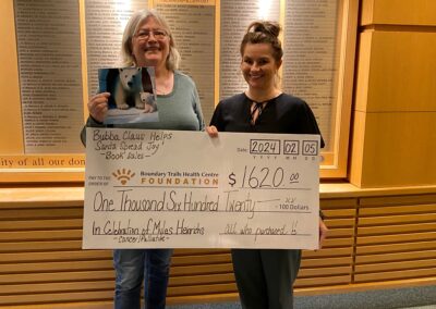 Dianne Heinrichs published her first book, Bubba Claus Helps Santa Spread Joy, just before Christmas. After losing her husband Myles to cancer and inspired by her own cancer journey, Dianne channelled her grief into writing a Christmas story using her husband’s holiday nickname, “Bubba Claus.” Over 700 books later, Dianne came to the hospital to present a cheque for $1,620 for cancer care at BTHC. The book has been read internationally, with people sending pictures from Japan, Australia, the Netherlands, the Philippines, the United States and across Canada. Thank you to everyone who purchased a book and supported not only BTHC but Dianne as well!