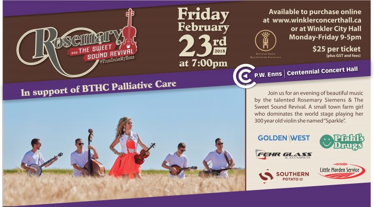 If you happen to have some cash laying around, $25.00 to be specific, consider putting it towards a ticket for the upcoming fundraiser concert at the PW Enns Centennial Concert Hall. The proceeds are going to the Boundary Trails Health Centre Palliative Care Program. Performing at the concert is Rosemary Siemens and The Sweet Sound Revival. Here she shares with us why a fundraiser like this is necessary and important.