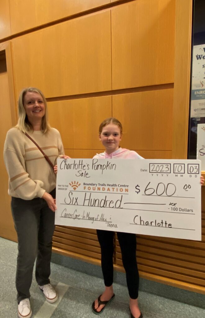 When sales at Charlotte McCutcheon’s pumpkin stand exceeded expectations, she felt grateful for the support from her customers and community and wanted to give back. Charlotte and her family stopped by the hospital to donate $600 raised at her pumpkin sale to cancer care at Boundary Trails Health Centre, in memory and honor of Alex and Teena. Thank you Charlotte and all your pumpkin customers for supporting cancer patients and their families at BTHC!
