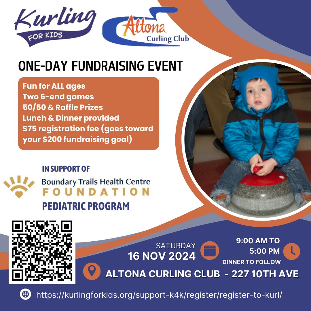 The Altona Curling Club is welcoming Kurling for Kids back for its second year. Building on last year’s success, this one day, “fun”spiel raises money for the BTHC Foundation and the emerging pediatric department at the hospital. The event is coming up Saturday, March 7th and open to curlers of all ages and abilities.